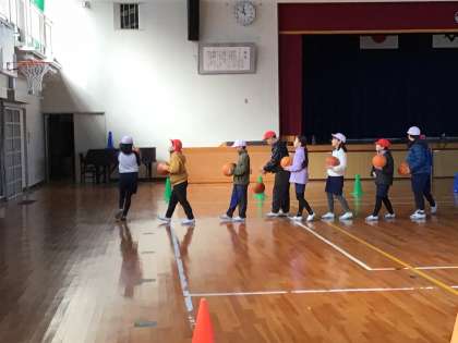 4年生は体育で、バスケットボールを使って、シュート練習を行っていました。