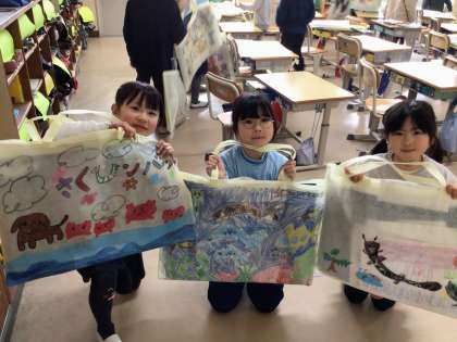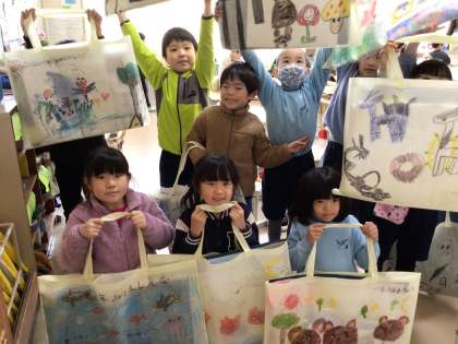 1年生が、図工で作品を持ち帰る用のバッグに、絵を描きました。