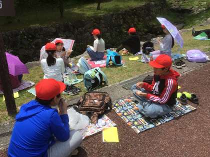 いい天気に恵まれ、歩き疲れた子どもたちは、お昼ご飯を食べて、パワーを充電中です。
