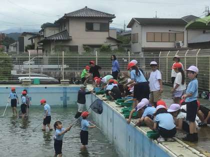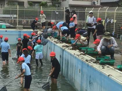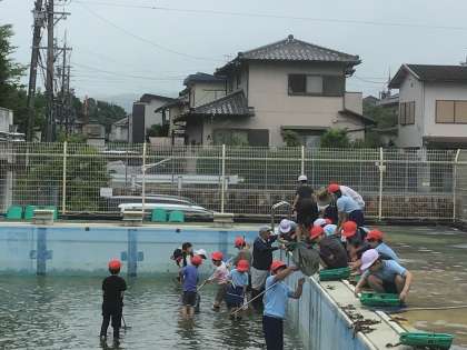 プール清掃の前に、ヤゴ救出作戦を行いました。今年は、たくさんのヤゴを救出することができました。