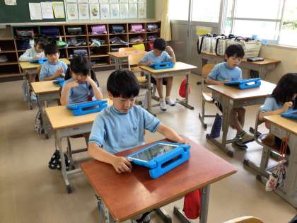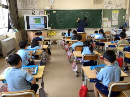 2年生の教室を見にいくと、スクラッチというアプリで生き物を選び、競走するよう、プログラミングの学習を行っていました。