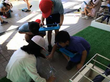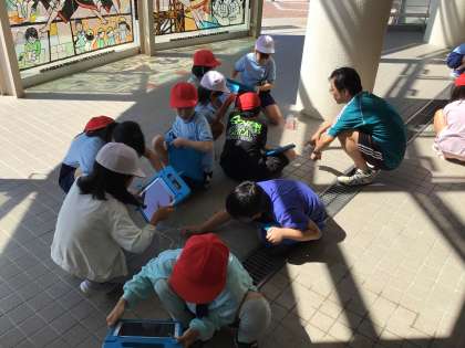 運動場は気温が高すぎたため、昇降口で実験しています。