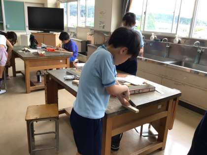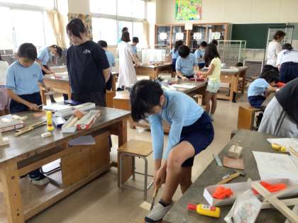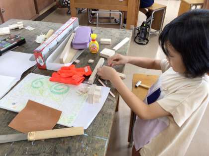 4年生が、板をノコギリで切り、切ったものを組み合わせて作品を作りました。