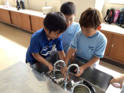 片方のやかんに水をいっぱいに入れた後、もう一方のやかんに水を移し替えて比べました。