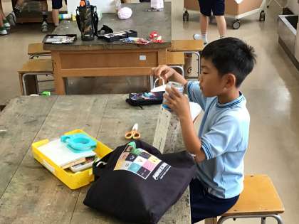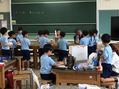 2年生が身近な物を使って楽器を作っています。