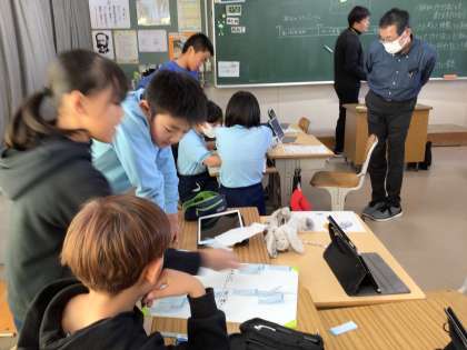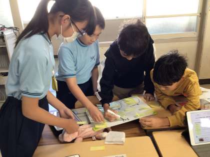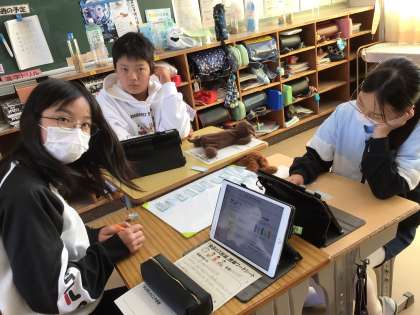写真は、グループで話し合い、食品ロスを防ぐための方法を考えているところです。