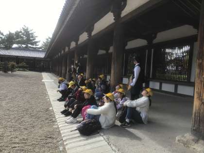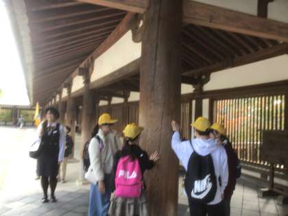渋滞もなく、無事、法隆寺に到着です。ガイドさんの話をしっかりと聞いて、学んでいました。