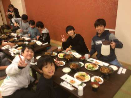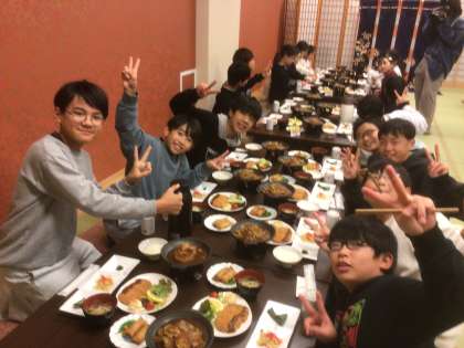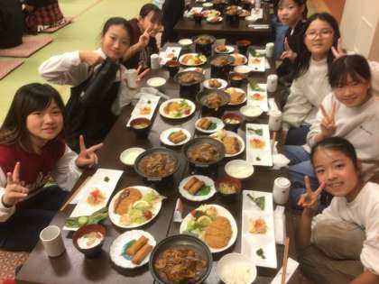 京都駅を散策した後は、お待ちかねの夕食です。ハンバーグ、とんかつ、春巻と豪華な食事を楽しみました。ご飯をおかわりする人もいました。