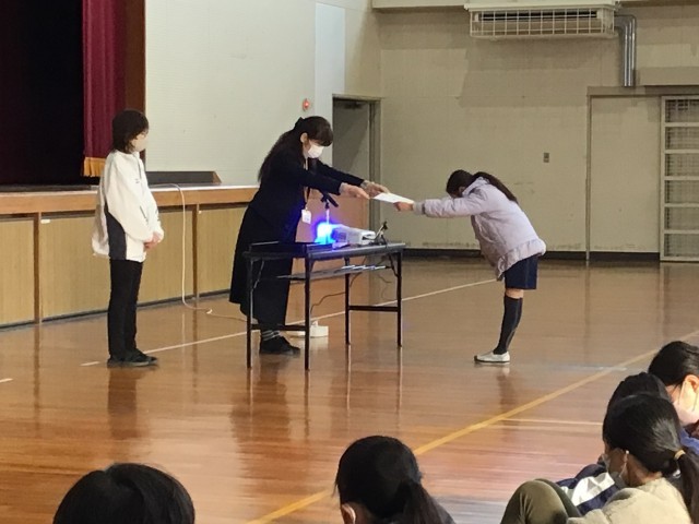 読書感想画、書き初め大会、人権に関するコンクールで優秀な成績を修めた児童に表彰状が渡されました。