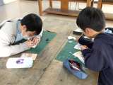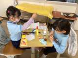 一年生がドングリや松ぼっくりなどを使って、おもちゃを作っています。