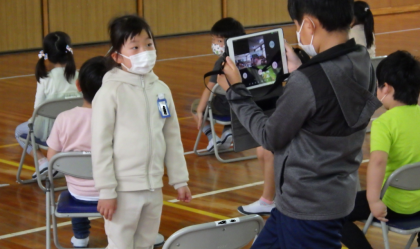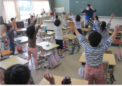 曲に合わせて体を大きく動かして、踊りました。にこにこして踊っている子どもたちの姿...