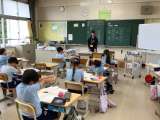 児童の下校後、先生たちが勉強しています。
