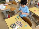 1年生がうちわ作りをしました。 プラスチック板にめいめい好きな絵を描いたり、...