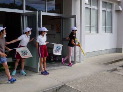 いわくらっこの旗をもって「おはようございます。」と元気いっぱいです。