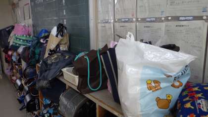 4年生の教室のロッカーには、保護者の方が準備してくださった着替えや長靴が並んでいました。
