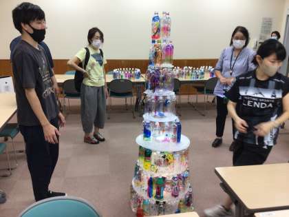 子供たちが希望をテーマにイラストや模様を描いたペットボトルを積み上げたタワーです。