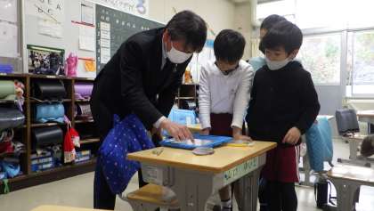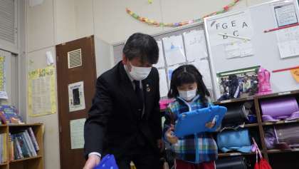教育長も1年生にタブレットを借りて挑戦し、「みんなの方が点数が高いな。」