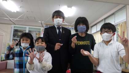 写真下、保健室で、手洗いキャンペーンに参加されて。