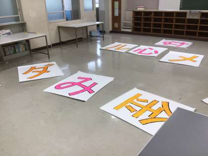 運動会のテーマを校舎の窓から掲示します。