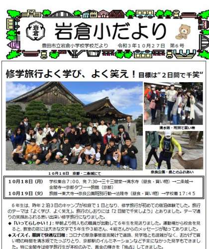 学校だより10月号 公開日 2021/10/27 更新日 2021/10/27 お知らせ ご一読ください・ 学校だより10月号←ここをクリック <今月号の内容> 修学旅行「よく学び、よく笑え」 今週土曜、運動会 コロナによる登校自粛の変更 登下校ボランティアアンケート 栄光の記録