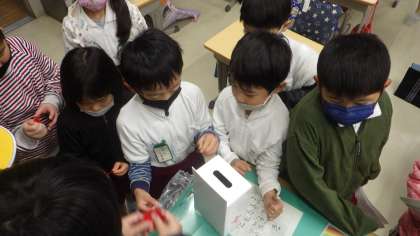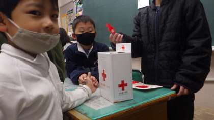 赤い羽根募金が始まりました。 朝の1年生の教室です。