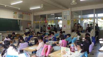 1年生は、小学校に入学して初めての授業参観。算数「かずとすうじ」の勉強です。お家の人が見に来てくれたことがとてもうれしそうでした。たくさんの方に参観していただきました。