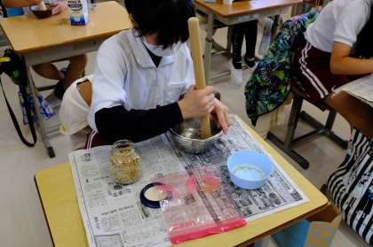 5年生は、収穫したお米のもみすりに挑戦中です。すり鉢や牛乳パックなど、自分のできる方法で取り組んでいます。米作りも、代掻き、田植えや害虫駆除など、田んぼやバケツ稲の世話を通して、ようやくここまできました。茶碗1杯のご飯を作るためには、本当に多くの手間をかけ、世話をしなければならないことを実感しています。