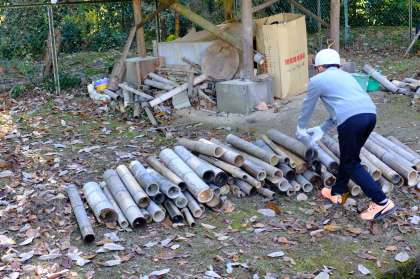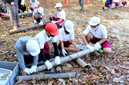 まずは、材料の竹を切る作業です。学校にある竹は太く、切ってから少し細くしなければなりません。みんなで協力し合いながらなんとか必要な分を切り終えました。
