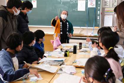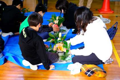 6年生は、和凧とミニ門松づくりです。和凧もあらかじめ好きな絵をかいておいた紙を竹ひごに貼り付けますが、この向きにちょっと工夫がいります。講師の方の説明を聞きながら、なんとか時間内に仕上げました。凧あげは休み明けに行いましたが、どの子も大はしゃぎでした。もう一つのミニ門松はこれからの季節にぴったりの工作です。講師の方が準備してくださった竹を組み合わせ、松や梅などを周りにさして、個性あふれるお正月飾りができました。