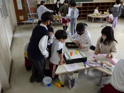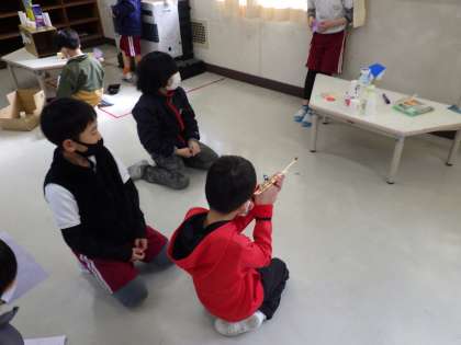 おもちゃで交流 1・2年生 公開日 2023/02/22 更新日 2023/02/22 特色ある学校づくり推進事業 <特色ある学校づくり推進事業だより> 2年生が作ったおもちゃを使って1年生と交流しました。 2年生は遊び方を分かりやすく伝えるために事前練習も行い、準備万端。 当日はみんな楽しく遊ぶことができました。 1年生にやさしく教える2年生の姿は、素敵なお兄さんお姉さんでした。