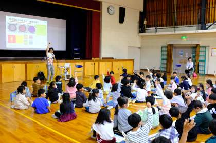 生き抜く力をはぐくむ事業 公開日 2023/11/14 更新日 2023/11/14 学校の特色ある活動 今年は1〜4年生が、授業に参加しました。 講師に三谷先生をお迎えして、「発想力〜イロのフシギ」をテーマに、みんなで身の回りにある色の秘密を考えました。 これから、身の回りの物を見たときに「なぜこんな色なのかな?」と考えてみるのも楽しそうですね。