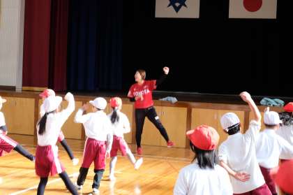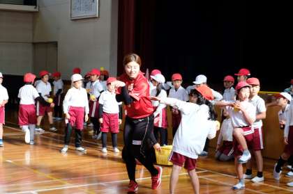 体育館で、みんなで鬼ごっこをして体をほぐした後、選手たちに遠くへボールを投げるコツを教えてもらいました。どの子も楽しそうに取り組み、中には体育館の半分以上の距離を投げた子もいました。