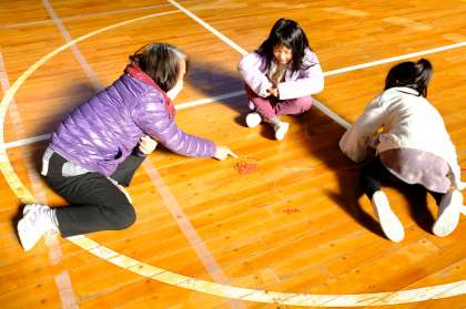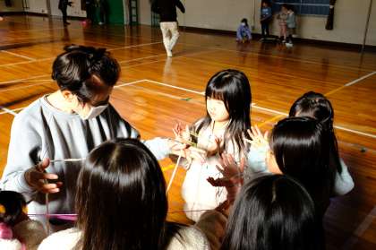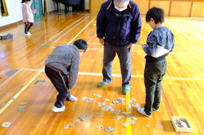 1年生が生活科の学習で、地域の方と一緒に昔遊びをしました。歌いながらお手玉をしたり、けん玉やおはじき、メンコやコマ回しなど、上手にできるコツをたくさん教えていただきました。1時間があっという間で、もっとやりたいと思う子たちばかりでした。地域の方にも「楽しかった。またやりたいですね」と言っていただきました。