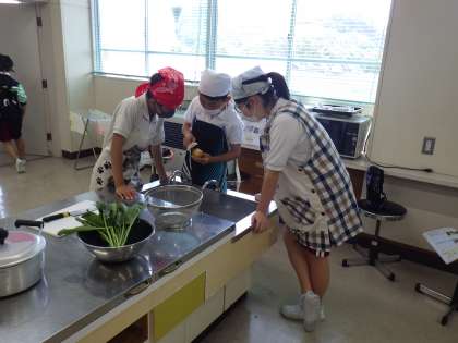5年生が、キャンプの飯盒炊飯の練習を兼ねて、家庭科の授業でゆでる調理をしました。手順を確認していざスタート。分担された仕事をしっかりとこなし、みんなで協力し合って、ほうれんそうのお浸し、ゆでいも、ゆで卵が出来上がりました。これでキャンプもばっちりかな?