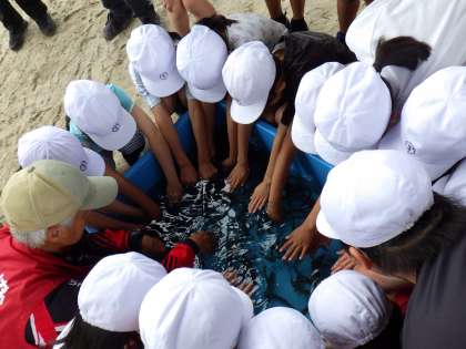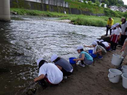 稚鮎放流体験 公開日 2024/05/18 更新日 2024/05/18 特色ある学校づくり推進事業 <特色ある学校づくり推進事業だより> 16日に、4年生が稚鮎放流体験をしました。 最初に鮎の特性や放流の仕方について説明を受けた後、いよいよ放流です。 水槽いっぱいの稚鮎をバケツに少しずつ入れて、巴川にそっと入れました。 事前にアユについて調べ学習をしたこともあり、活動後は所員の方にアユについて質問する姿も見られました。この様子はひまわりネットワークでも放送されます。