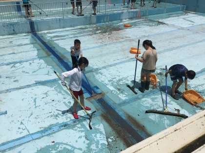 プールの側溝の中の落ち葉や、底にたまった泥を全員でかき出してくれました。みんなが気持ちよく使えるようにと2時間頑張って取り組んでいました。さすが6年生です。