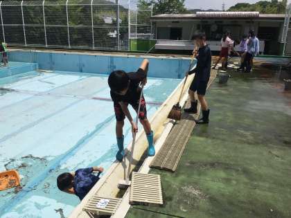 毎年水泳の授業が近づくと、6年生がプール掃除をしてくれます。