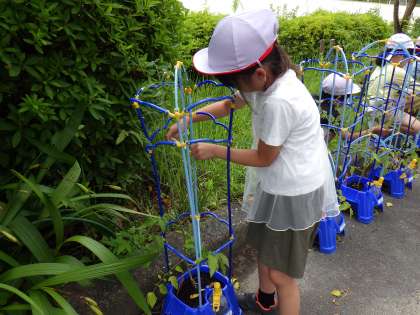 ミニトマトが育ってます 公開日 2024/06/18 更新日 2024/06/18 各学年から 2年生が、生活科でミニトマトを育てています。もう、実がついていたり赤くなっていたり。自分のミニトマトを嬉しそうに観察しています。月曜日は、脇芽を取ったり、茎をひもで結んで倒れないようにしたりしていました。 これからたくさん実がなりそうです。