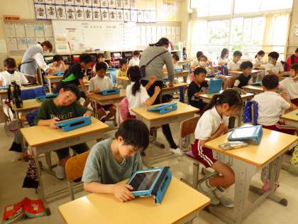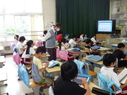 岩倉小では、年に3回ICT支援員による授業サポートを受けてタブレットを活用した授業をしています。教員のタブレット活用技能向上を目指した取り組みです。タイピングや問題作りなど、学年に応じた学習をしています。