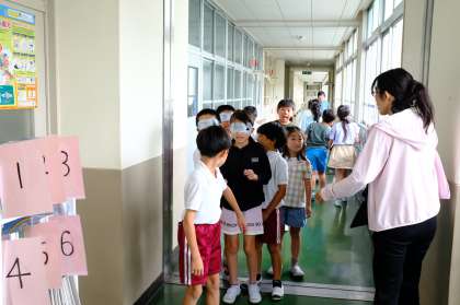 視覚障がいのある方を講師に、点字とアイマスクをしての歩行体験をしました。アイマスクをつけての体験は、友達に手を引いてもらっても不安があり、普段はどのような工夫をして生活しているのかを聞き取りました。また、点字体験では、実際に自分の名前を点字にしてみました。この体験を通して、周りへの思いやりをさらに深められるといいです。