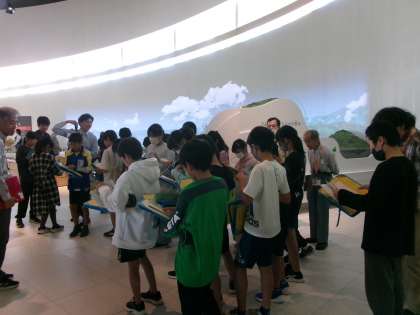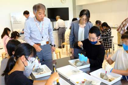 体験では、みんな一生懸命に石を削り、化石を見つけて大喜び。