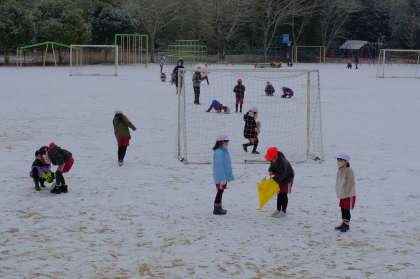 10日の朝、運動場は雪で真っ白に。