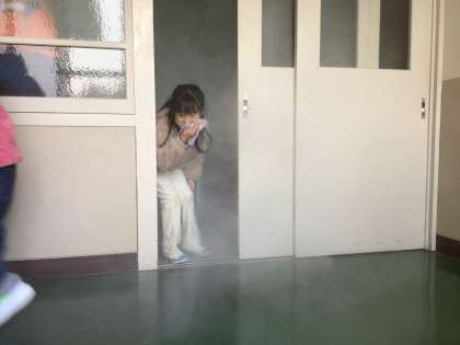 そのあと、3学年に分かれて煙道体験、防サイ君による地震体験、救助袋による避難体験をそれぞれ行いました。いざという時に備えて、とても大切な訓練になりました。