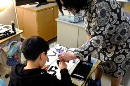 書き初め用紙の長さに苦労しながらも、一文字ずつ丁寧に書いていました。
