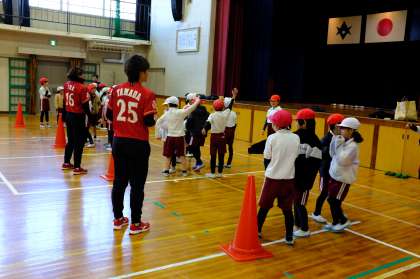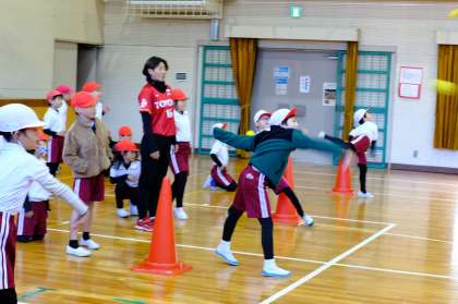 体育館で、リレーをしてウォーミングアップをした後に、ボールの握り方や投げ方を教えていただきました。