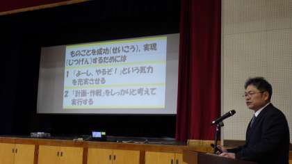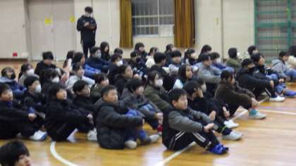 冬休み明け集会では、校長先生から「次の学年に向けてのまとめの時期」であること、相撲の「はっけようい」の意味から「気持ちをもって取り組むことの大切さ」についてお話を聞きました。