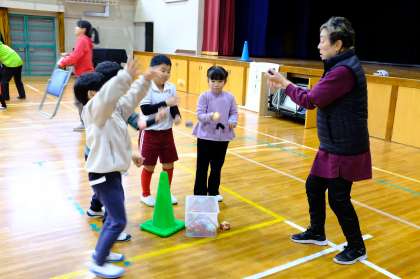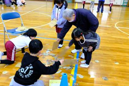 コマを回すための紐のまき方を教えてもらったり、メンコをたくさん取るためのコツを聞いたりしながら、いろんな遊びに挑戦しました。