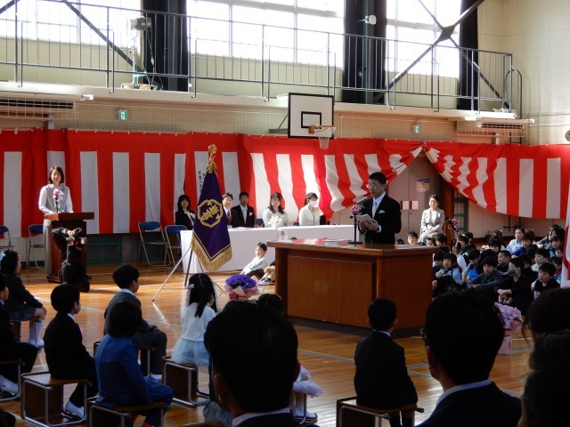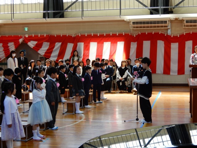 天候にも恵まれ、桜吹雪が舞い散る中、1年生22人が元気に入学しました。