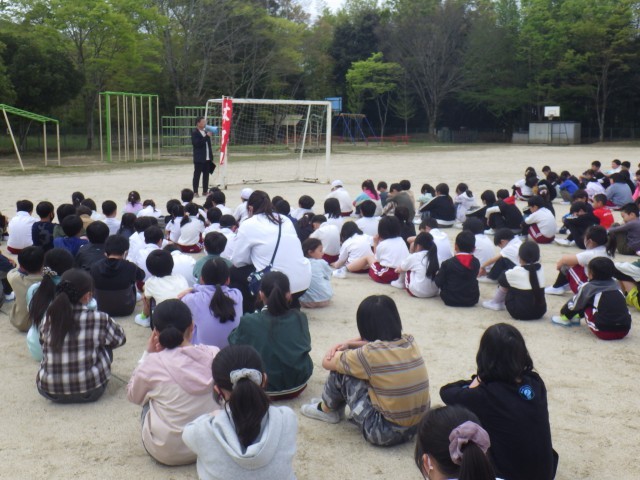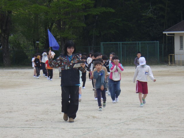 職員室から出火した想定で、運動場に避難する訓練を行いました。