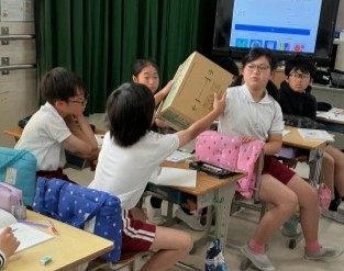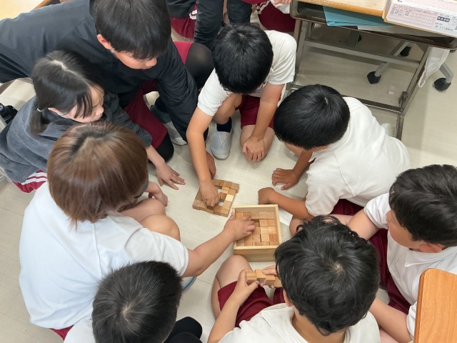 5年生の体積の学習では、2つの段ボール箱のどちらが大きいかを予想した後、立方ブロックで確かめました。実際に触ったり、友達と意見を交えながら自分の考えをもって予想してから、ブロックの数で確かめることができました。